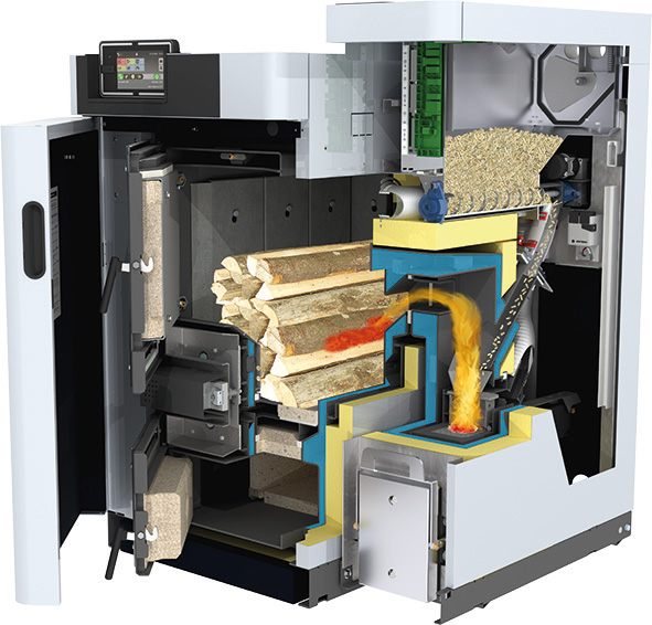 Der Scheitholz- und Pelletskessel SP Dual compact kombiniert zwei perfekte Systeme – in zwei getrennten Brennräumen erfüllt er alle Anforderungen an die Brennstoffe Scheitholz und Pellets. Hohe Wirkungsgrade und hoher Komfort – niedrige Emissionen und Energiekosten zeichnen den SP Dual compact aus. Darüber hinaus hat der SP Dual compact nur einen Wärmetauscher, eine Rücklaufanhebung, eine Steuerung und ein Abgasrohr, welche für beide Betriebsarten verwendet werden.